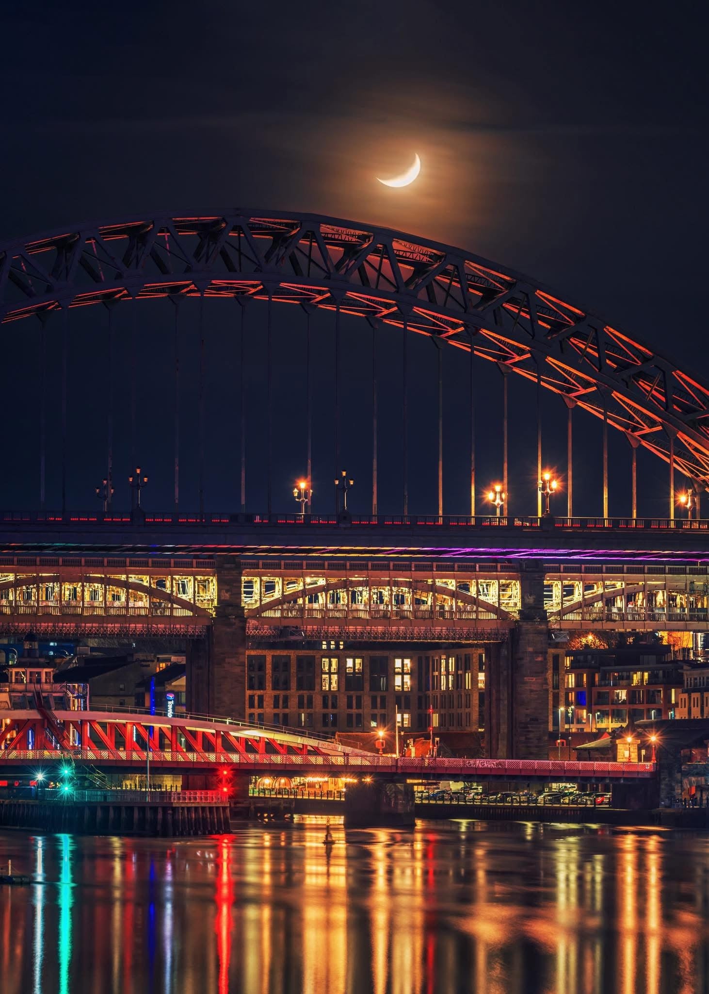 A crescent moon above the Tyne Bridge.