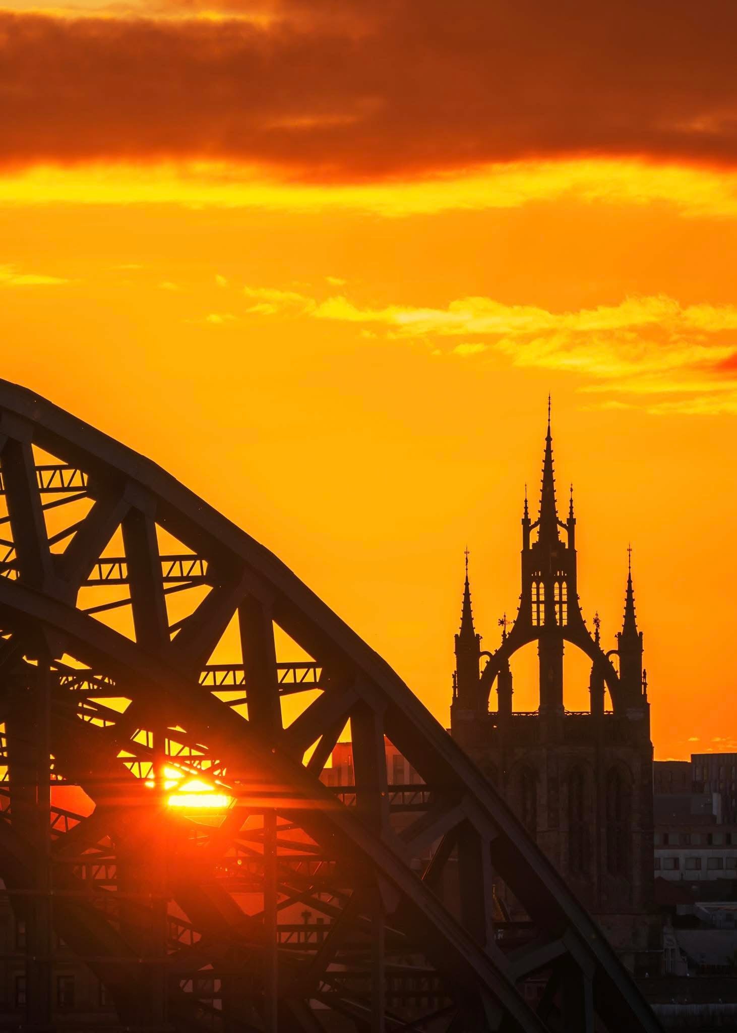 Tyne Bridge and Newcastle Cathedral at sunset.